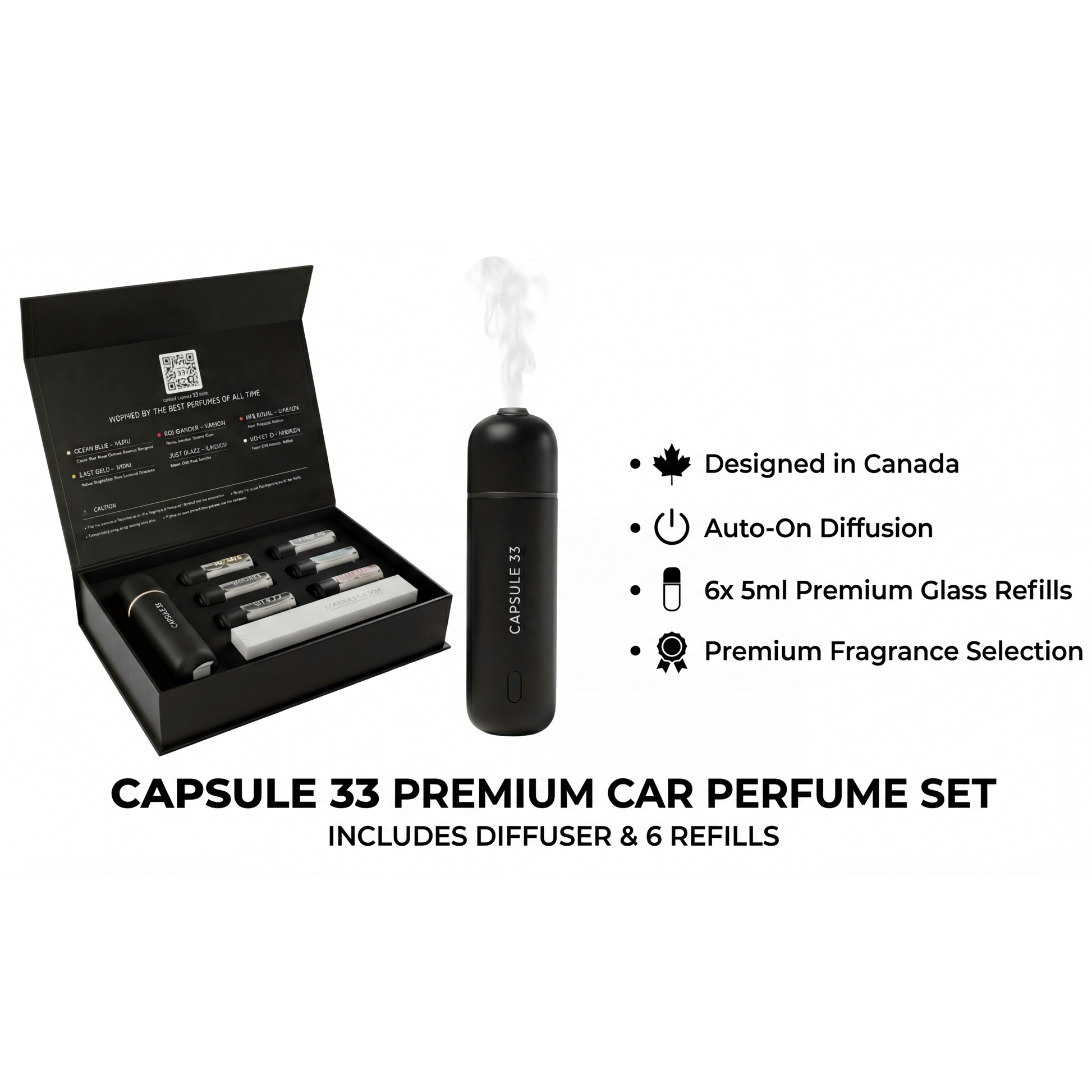 - 6 SIGNATURE SCENTS INCLUDED: Our Capsule 33 Car Diffuser comes with 6 distinct 5mL car perfume chargers. For men, women, and unisex preferences,