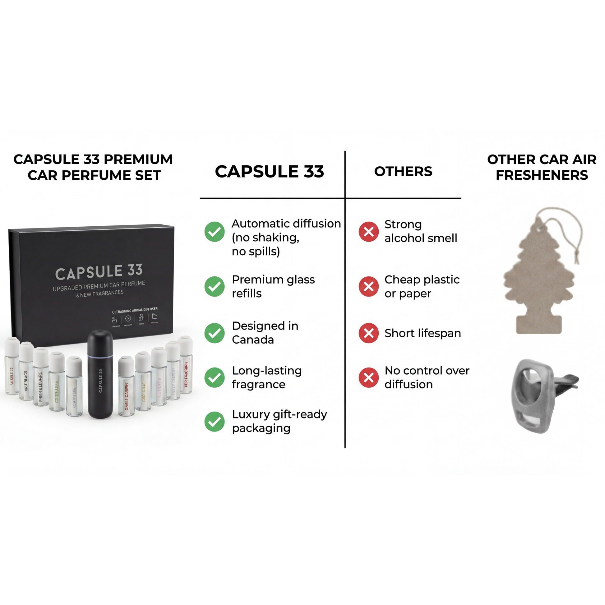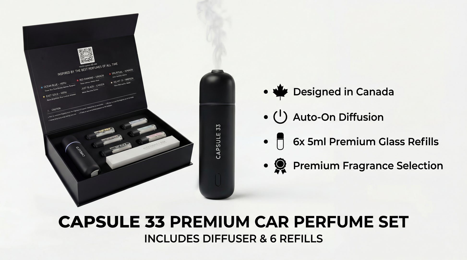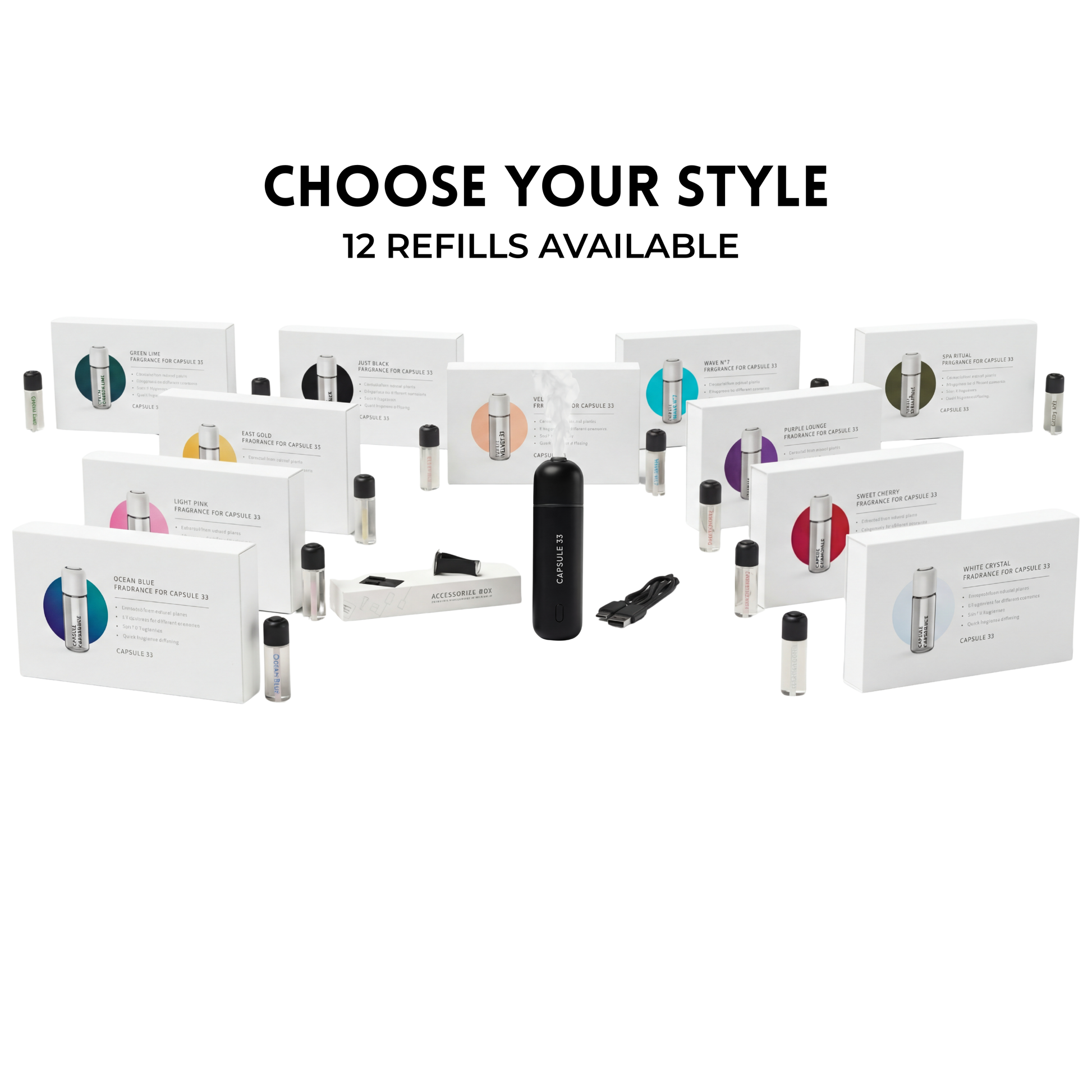 - Premium Glass Refills: High-quality glass bottles preserve fragrance integrity and provide easy installation into your Capsule 33 device